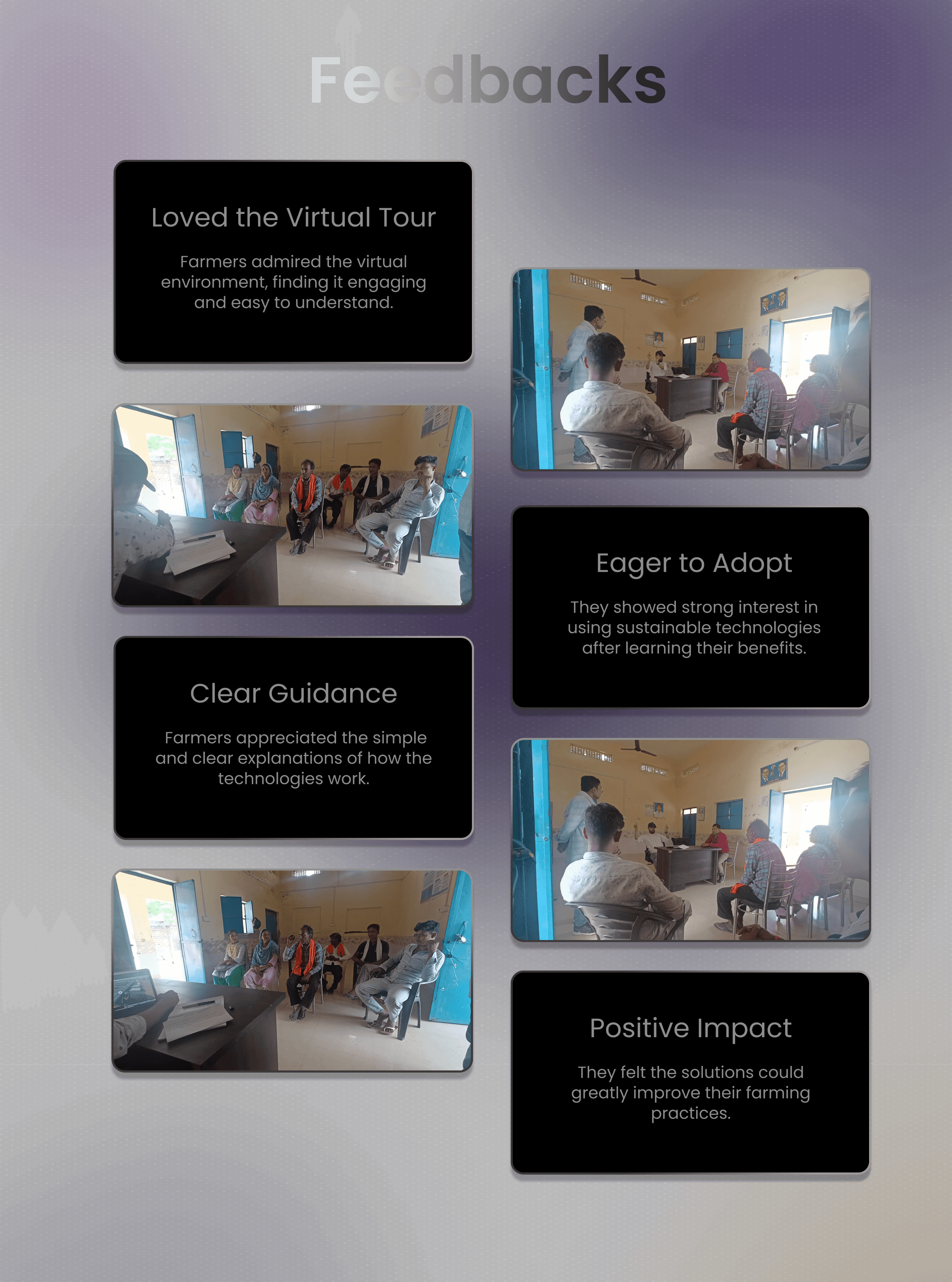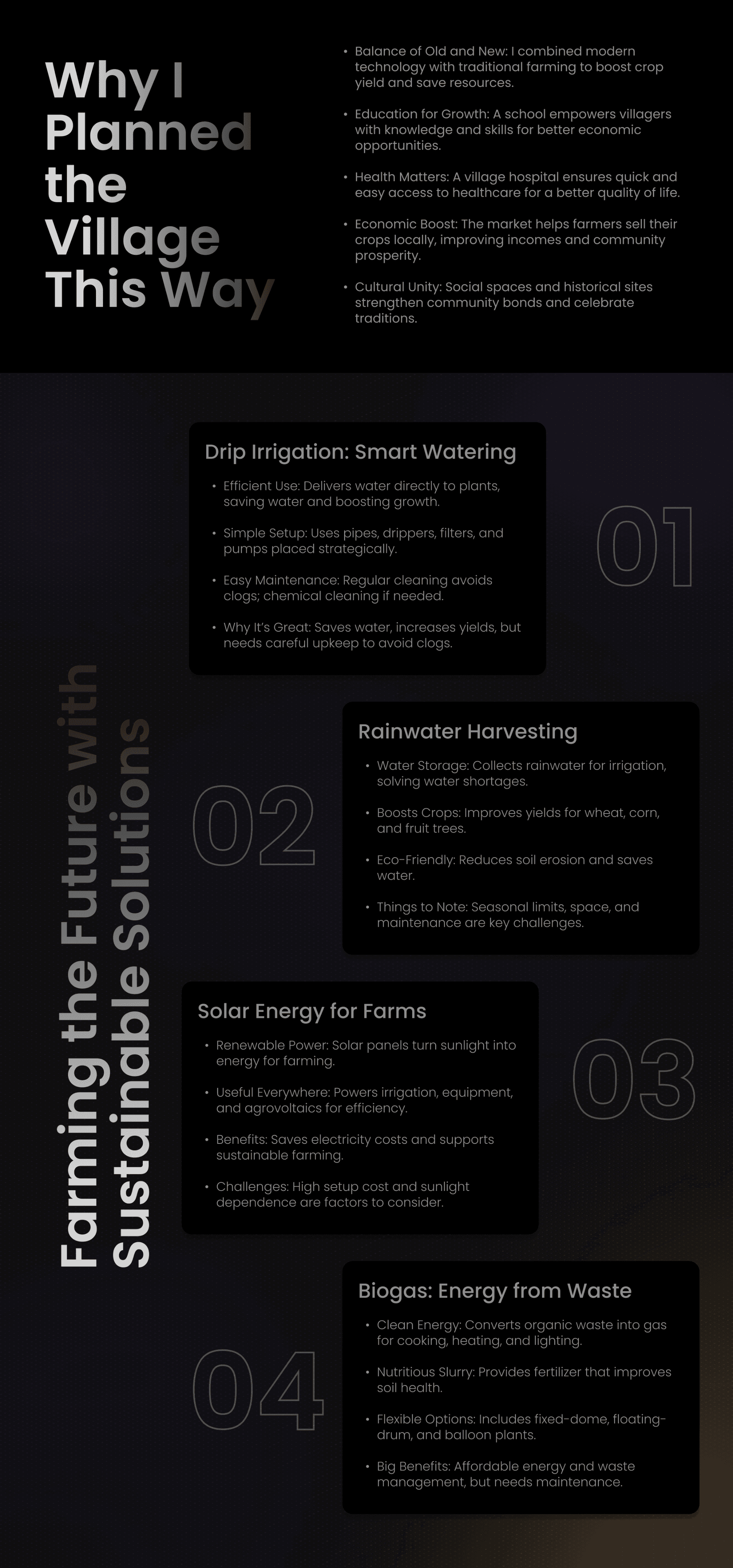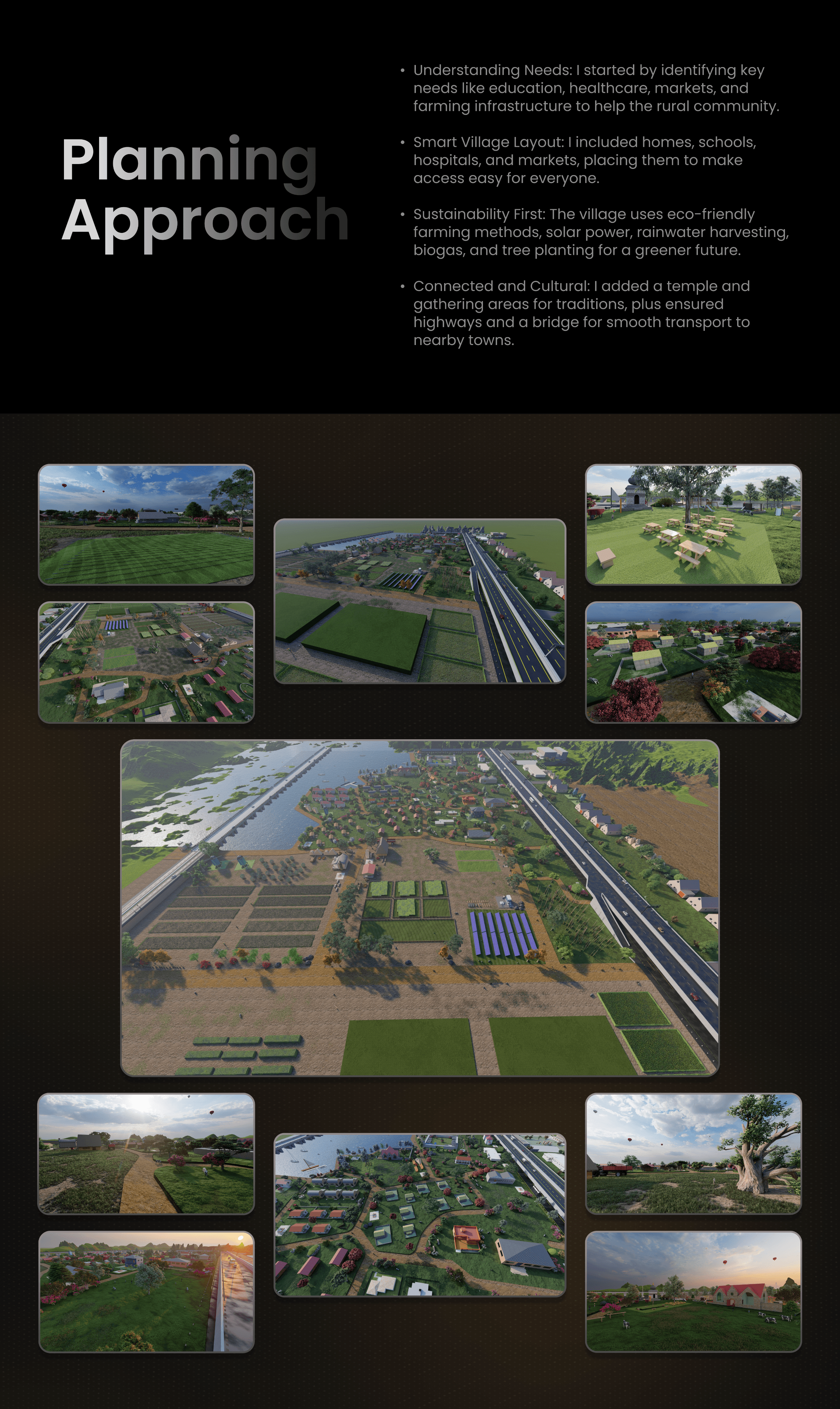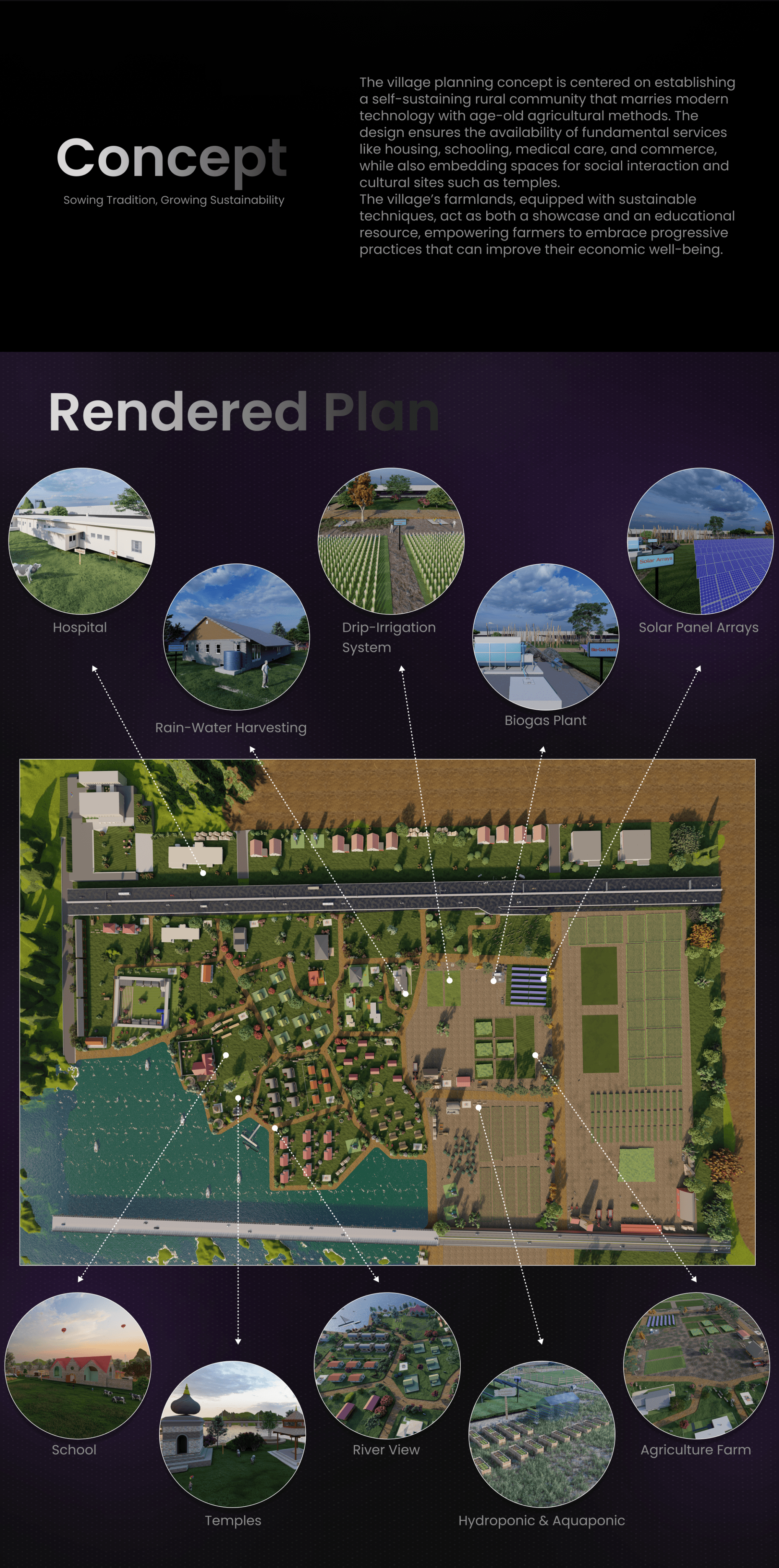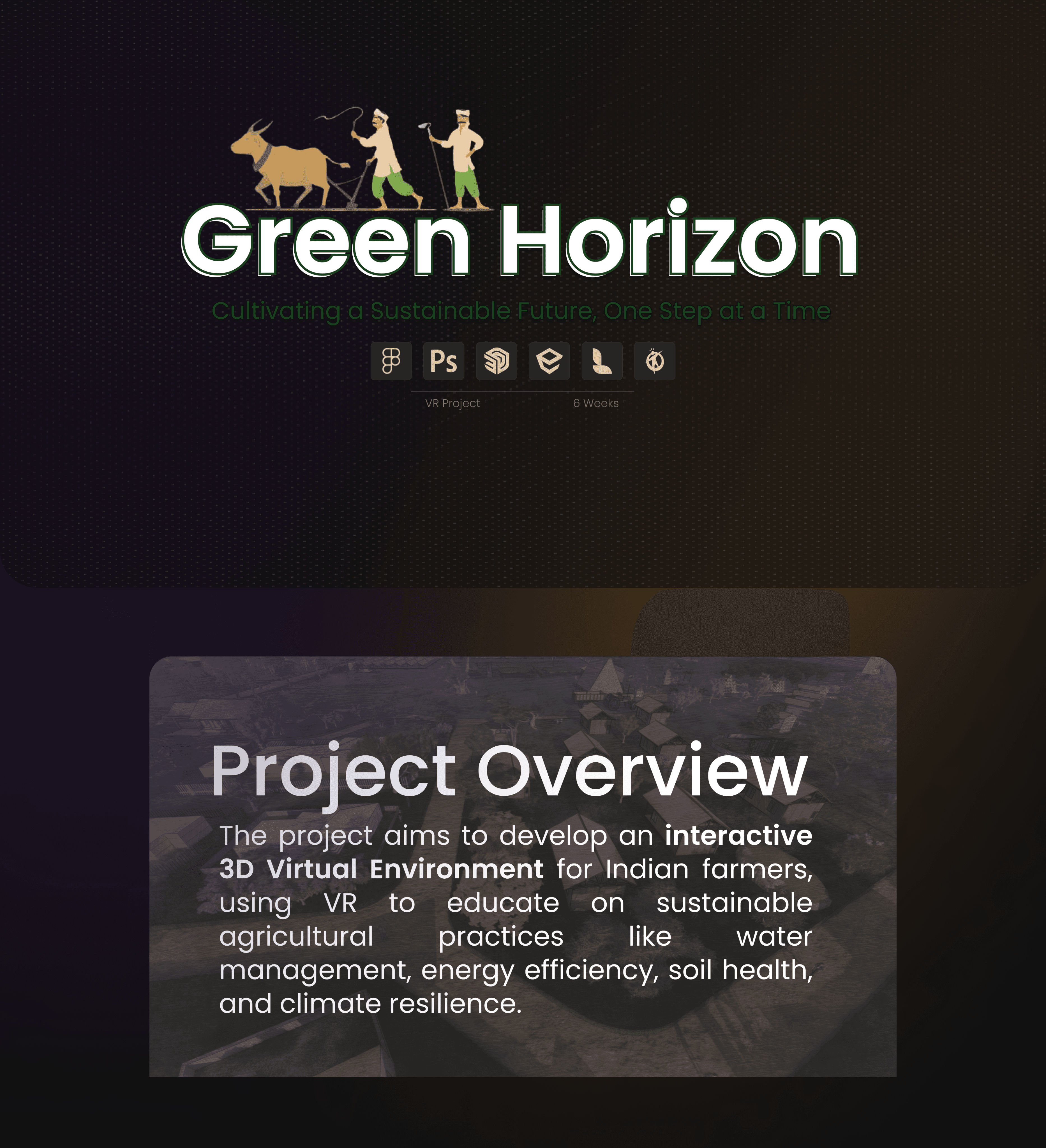 An interactive 3D virtual village educating farmers on sustainable practices like water management, energy efficiency, and soil health through immersive VR experiences for better farming.